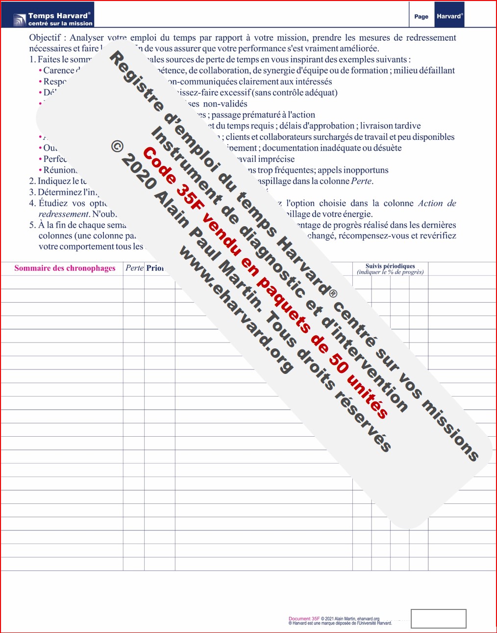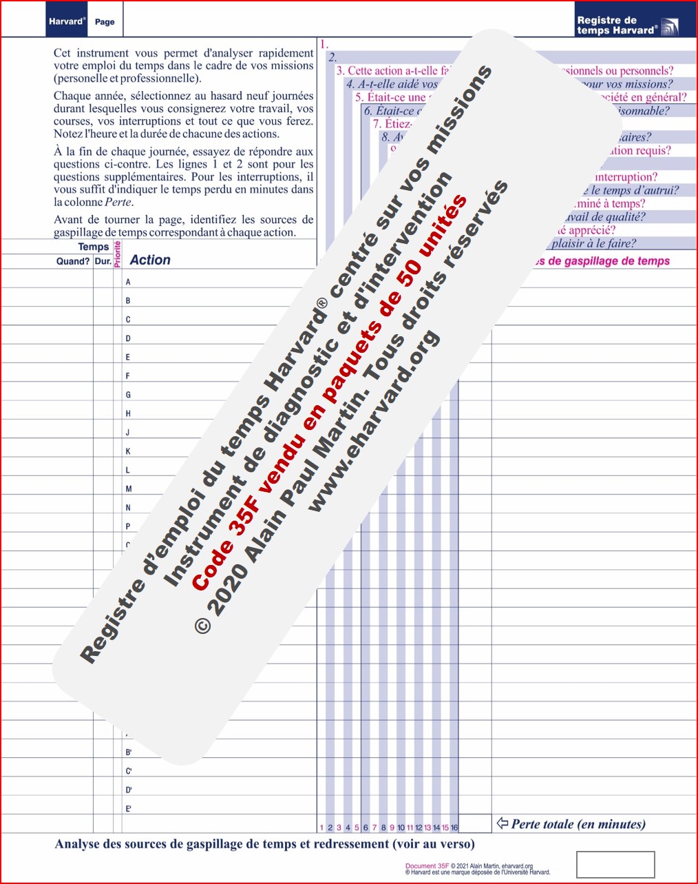Avec le « Registre d'emploi du temps Harvard® est un instrument pratique qui