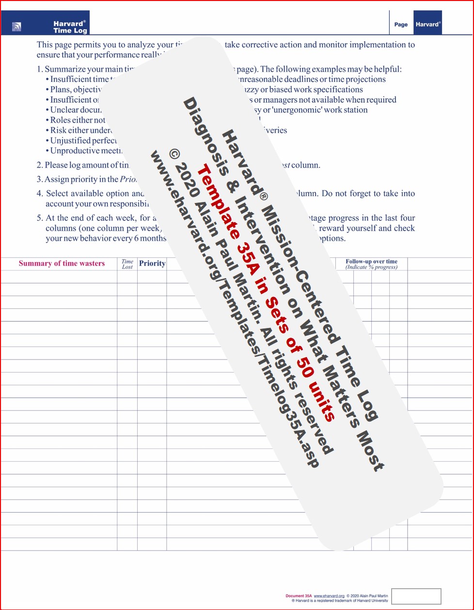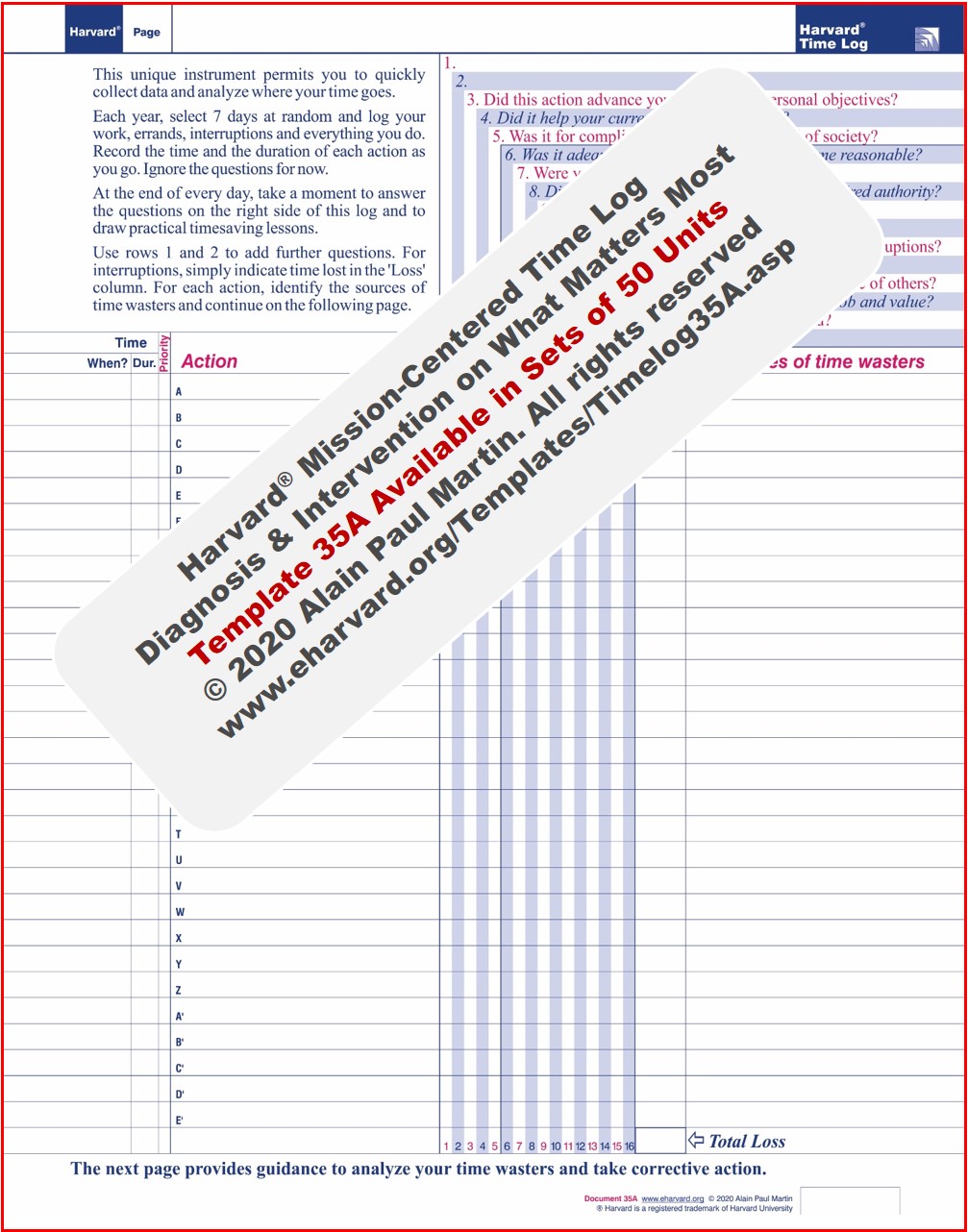 Tracking time through continuous logging of everything you do is a time-consuming and inefficient task, be it for a whole week or any contiguous period of time. No week is representative of your workload which can peak on which can peak on a specific week, month, season or even a calendar day (e.g. month ends, Mondays). It is also is prone to the law of diminishing-return errors, As an illustration, after a while, those who alternate between tasks, or are in a frequent multi-tasking mode, tend to neglect or forget to track their work in real time. With the Harvard® Professional Mission & Quality-of-Life Time Log, logging time requires neither a change in your work habits nor in your day-to-day behavior. You simply select a new day of the week every five weeks and log your work, fitness, rest, errands, interruptions, personal endeavors and everything you do on that day only. If you have filled a couple of templates, end the the data gathering; but resume the process at the same time five weeks later to cover the missing part of the day. The frequency of logging every five weeks can be adjusted to 3 weeks in areas or periods of high diversity and uncertainty. Avoid a monthly frequency to prevent tracking the same period of the month and miss the rest. At the end of the time-logging day, take a moment to address three kind personal and professional quality-of-life questions: (a) Effectiveness questions related to your personal, family and organizational mission, (b) Productivity/efficiency questions related to how you live, work and (c) Impact questions related to outcome/results; all from a 360 degrees perspective. The Log provides blank columns for other important professional and quality-of-life questions you care about. These questions and the analytic approach in the back-page provide the framework to analyze, take corrective action and track life-managment progress as you go, to ensure a greater focus on priorities and a sustainable mission-driven performance improvement. Thus, you can identify life/time-wasters and other roots of stress and inadequate performance (changing external environment, skills-deficits, role conflicts, delegation, sub-performing tools, outdated systems), distraction, procratination, sleep deprivation, attention fragmentation and the pattern of frequent interactions with specific people or repetitive-work clusters. Armed with facts, you can raise sensitive time-wasting and quality-of-life questions with your partner, coworkers and leaders. Some of your family members and teammates may not even realize the damage they inflict on you by their time-wasting behavior. Note that you can use the Harvard® Professional Mission & Quality-of-Life Time Log to zero-in on your interactions with your family, a client, a boss, a colleague or even a team, to address issues such as the cause(s) for stress, constant calls, interruptions or drop-in visits. For this purpose, log every interaction until you fill a couple of templates before conducting the analytic work. Maintaining peak performance, since the pandemic will continue to be challenging and more so in virtual teams. But the good news is we are not helpless, thanks to the integration of the best practices and knowledge from neurosciences, systems thinking, self-leadership and applied mathematics. We can act to take control of our present and future, both at work and in our daily lives, by allocating, to what matters most, our most-important scarce and non-renewable resource, namely time. Thus, we can deliver promptly without hasting nor succombing to the arbitrary-deadlines' tyranny. How we think and act, or fail to act, about where our time goes, affects our career, physical health and ultimately our brain, impinging on our well-being and peace of mind. The Harvard® Professional Mission & Quality-of-Life Time Log and the patented Harvard® Planner are two practical innovations and an integral part of Harvard University Global System™, a dynamic ensemble of both strategic and day-to-day decision-support instruments, aimed at synergistic individual and teamwork. These two instruments help us concentrate on mission and important goals, work diligently and melt away superfluous distractions. The ultimate goal is to progress from time management to self-leadership; alleviate toxic stress; enhance restorative sleep; feel relaxed and think with clarity to innovate and indulge in more pleasurable endeavors. |